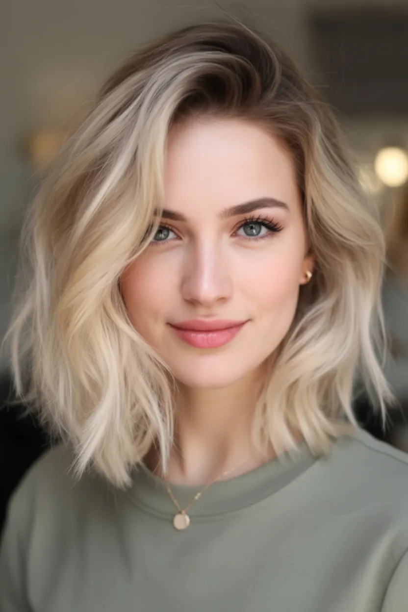 This textured Medium length blonde bob feels playful and bright—like a little burst of sunshine around your face. The airy movement keeps the shape from feeling heavy, while the length just below the chin subtly elongates round features. It’s soft, feminine, and completely modern.