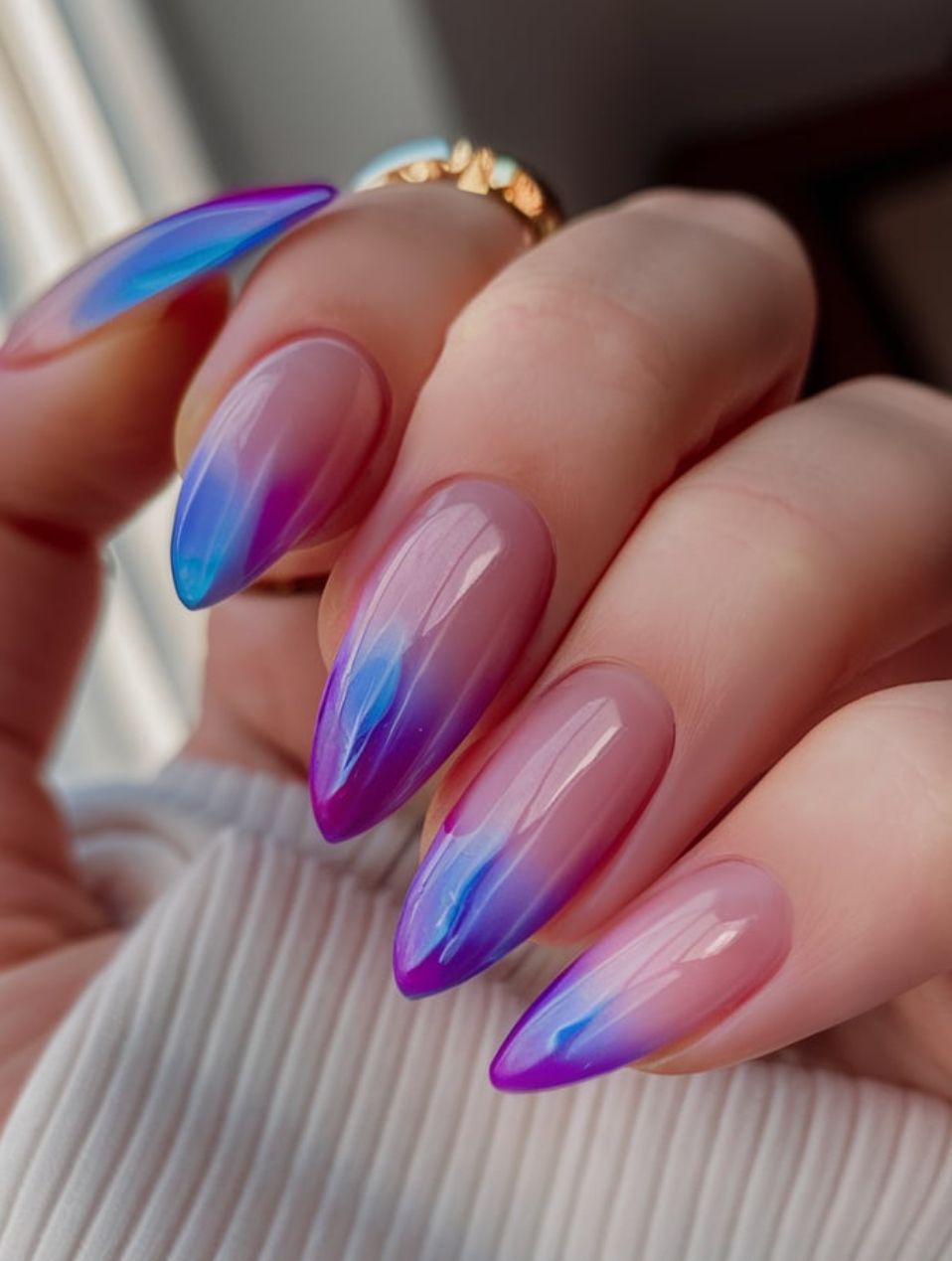 Blue ombré nails with subtle sparkle feel romantic and refined. The gradual fade from milky white to soft blue catches the light beautifully. Almond nails enhance the softness, while the ombré effect ensures graceful growth and long-lasting elegance.