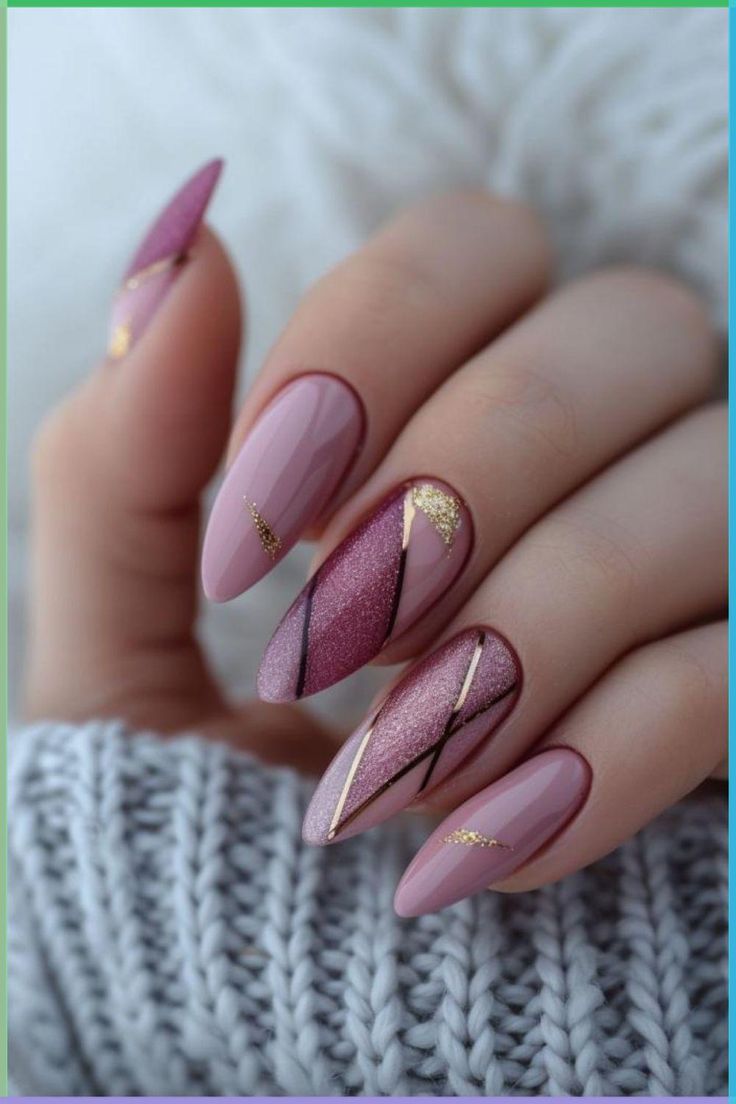 19. Mint and Blush Marble Almond Nails with Gold Lines