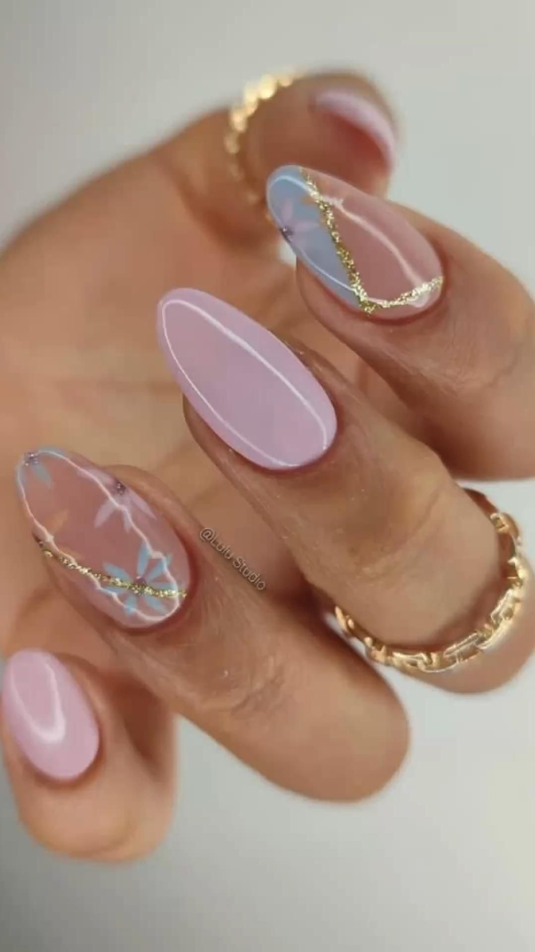 A soft nude base paired with blue and gold accents creates a quietly confident manicure. The abstract details elevate the simplicity, making this design versatile enough for work, casual days, or special spring occasions.