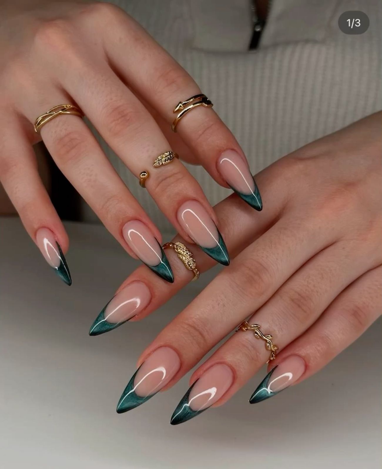 Turquoise foil accent nails offer a refreshing pop of color paired with subtle luxury. The gold foil detailing adds dimension without overpowering the manicure. Almond nails balance brightness and elegance, making this look perfect for spring days when you want something special yet wearable.